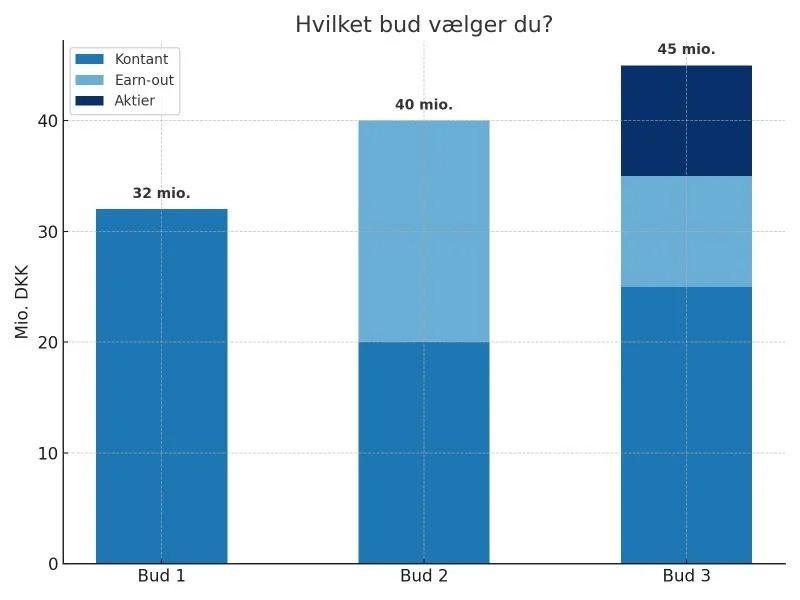 Når vi modtager bud på en virksomhed, er sælgers opmærksomhed – helt naturligt – på størrelsen af buddet. Men et bud er ikke bare et tal. Det er en konstruktion. Et puslespil af kontantbetaling, udskudt købesum, earn-out, aktier og måske endda fantasier om synergier.